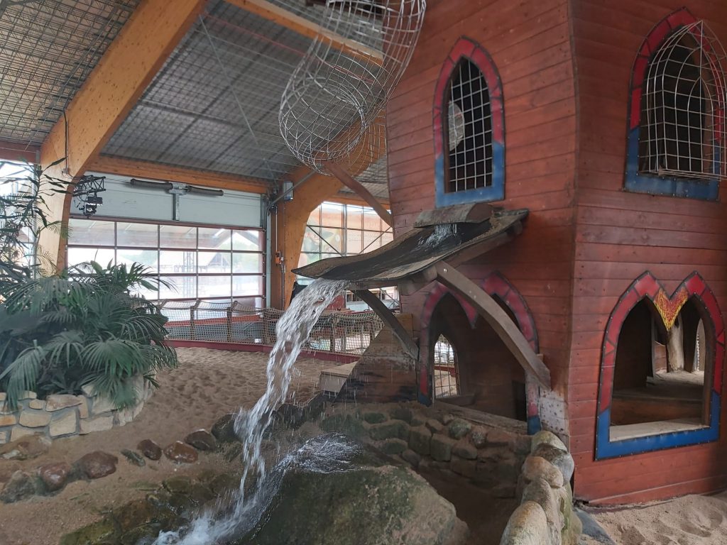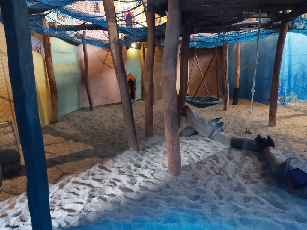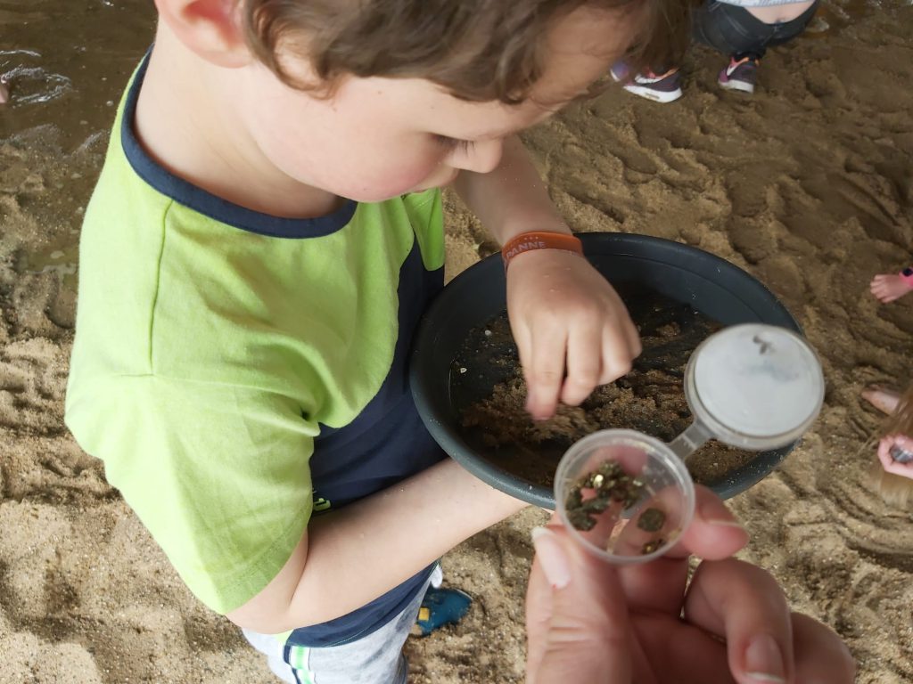 Binnen is een plas met water waar allemaal kleine stukjes goud liggen. Bij de balie van Avonturenpark Schateiland kan je een zeef kopen en met de zeef zand scheppen uit het water. Gelukkig hebben we de waterschoenen en korte broeken bij ons. Dus we kleden de kinderen om en gaan naar het water. De kinderen vinden het geweldig, maar de gaten in de zeef zijn echt te groot. Alles loopt er doorheen. Daar moet echt iets anders voor komen, maar het plezier is er niet minder om. Joshua haalt uit 1 schep 5 goudklompjes en is daarna niet meer te stoppen. Aan het einde van de dag willen ze dan ook nog een keer. “Mama, als we weer hier heen gaan wil ik nog een keer goud zoeken!”.